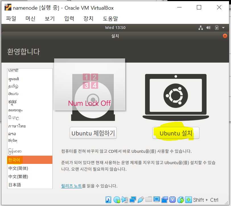 4-2. 실행을 하면 우분투 언어를 한국어로 선택하고 Ubuntu 설치를 클릭한다.