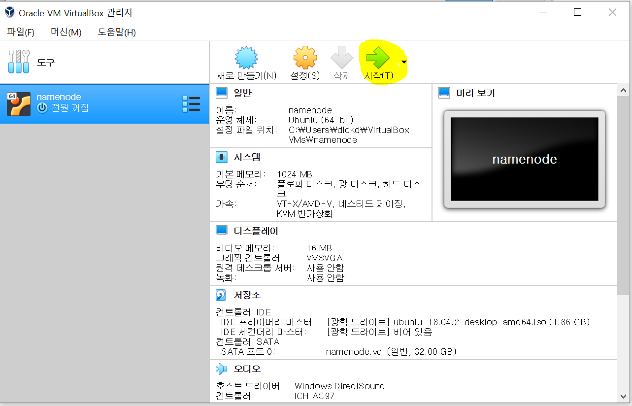 4-1.우분투 ISO 파일을 넣었으면 시작을 클릭해 Virtual Box를 실행시켜 준다.