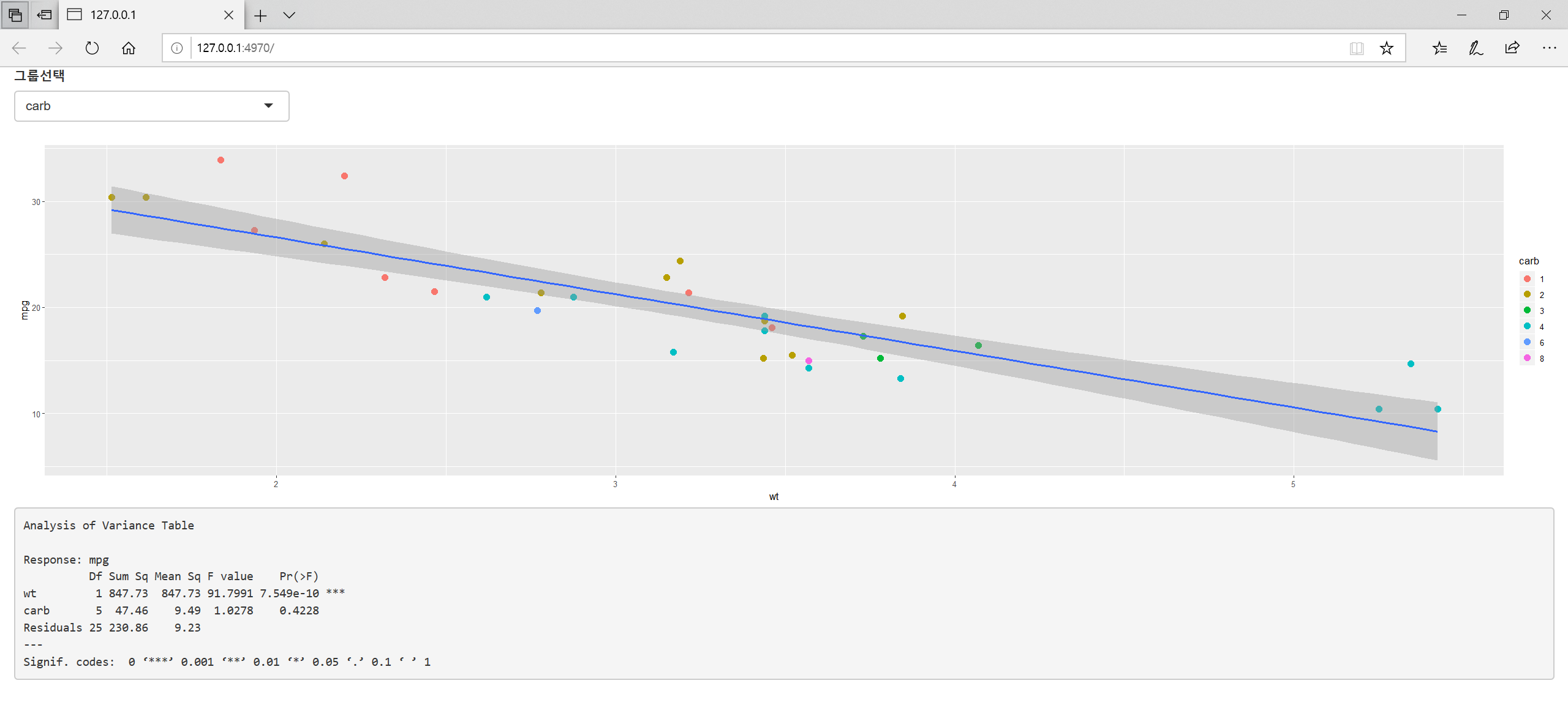 UI 코드에서는 wt,mpg 이외의 레전드에서 사용할 변수를 선택하려고 selectInput() 이라는 입력 위젯 함수를 사용했다.